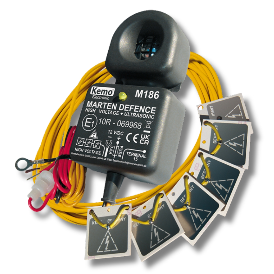 Kemo M186 to zaawansowane urządzenie zaprojektowane do skutecznego odstraszania kun, łasic, myszy i innych gryzoni z pojazdów mechanicznych. Dzięki połączeniu emisji ultradźwięków o częstotliwości około 22 kHz oraz impulsów elektrycznych o napięciu 200–300 V/DC, urządzenie tworzy nieprzyjazne środowisko dla szkodników, skutecznie zniechęcając je do przebywania w chronionym obszarze.